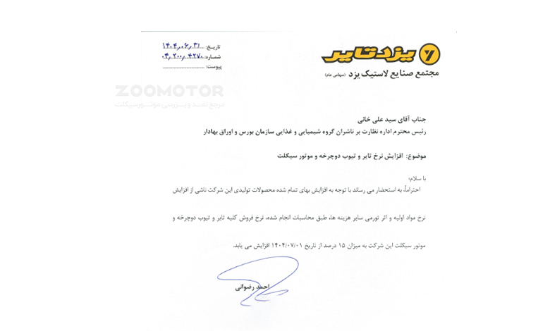 تنها دو روز پس از این مصاحبه، یعنی امروز دوشنبه ۳۱ شهریور ۱۴۰۴، مجتمع صنایع لاستیک یزد با انتشار اطلاعیه‌ای در سامانه کدال (ناشران)، به طور رسمی خبر افزایش ۱۵ درصدی قیمت محصولات خود را از اول مهر ماه ۱۴۰۴ اعلام کرد. این مصوبه هیئت‌ مدیره، شامل قیمت لاستیک و تیوب‌های مخصوص دوچرخه و موتورسیکلت است.