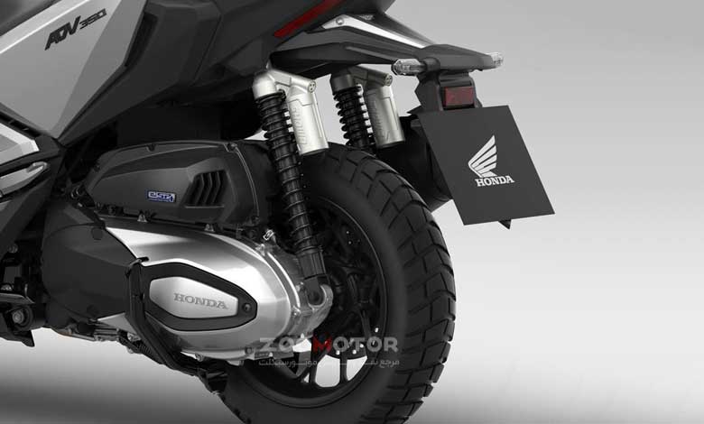در قسمت عقب، دو کمک‌فنر گازی با مخزن خارجی (Remote Reservoir) تعبیه شده است که ۱۳۰ میلی‌متر جابجایی فراهم می‌کنند. در مدل‌های ۲۰۲۵ و ۲۰۲۶، این کمک‌فنرها قابلیت تنظیم پیش‌بار (Preload) را نیز دارا هستند که به راکب اجازه می‌دهد سیستم تعلیق را بر اساس وزن بار یا وجود ترک‌نشین تنظیم کند. این ترکیب تعلیق، ADV 350 را به یکی از بهترین گزینه‌ها برای عبور از جاده‌های بی‌کیفیت و مسیرهای خاکی تبدیل کرده است، هرچند چرخ‌های کوچک (۱۵ اینچ جلو و ۱۴ اینچ عقب) همچنان در مواجهه با گودال‌های عمیق محدودیت‌هایی دارند.