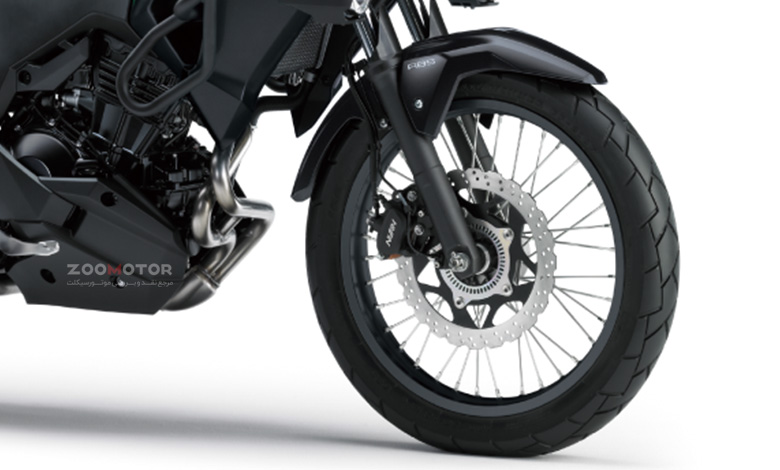 کاوازاکی تمام تمرکزش رو روی کارایی در جاده و خاک گذاشته. ارتفاع موتور از سطح زمین، سایز رینگ جلوی ۱۹ اینچی، رینگ‌های وایر اسپوکی (پره‌ای) و کورس بالای کمک‌فنرها داره داد می‌زنه که من به جز کروز کردن، قابلیت آفرودی خیلی خوبی هم دارم. تعلیق جلو یه جفت کمک‌فنر تلسکوپی معمولی با قطر ۴۱ میلی‌متره که غیرقابل تنظیمه.
