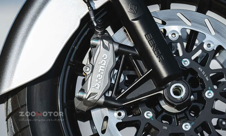 برای ترمز هم خیالت آدمو راحت میکنه؛ دو دیسک ترمز جلو داره که کالیپرهای شعاعی Brembo چهار پیستونه اونا رو نگه میدارن و سیلندر اصلی Brembo هم باهاشون ست شده. چهار تا اگزوز – دوتا از هر طرف – هیچ شکی باقی نمیذاره که با یه موتور چهار سیلندر طرفی.