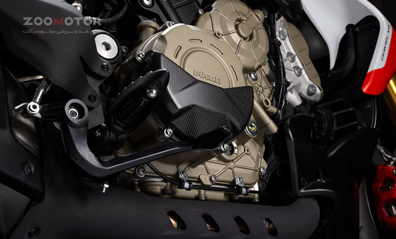 از نظر فنی، یه نکته‌ی خیلی خفن اینه که این موتور ، همچنان از میل‌ لنگ ضد دوران استفاده میکنه. (که این یه ترفند باحاله و چون خلاف جهت چرخ‌ها می‌چرخه، باعث میشه موتور توی پیچ‌ها تیزتر عمل کنه).اما دوکاتی نخواسته فقط به این بسنده کنه: گیربکس رو جوری تنظیم کرده که تو دنده‌های پایین، شتاب دیوانه‌ وارتر و قوی‌تری بهت بده. تازه، یه فیلتر هوای پرجریان جدید هم براش گذاشتن و محدوده‌ی مجاز دور موتور هم توی اکثر دنده‌ها روی ۱۳,۵۰۰ دور در دقیقه قفل شده؛ یعنی تا ته گاز بخور! 😉
