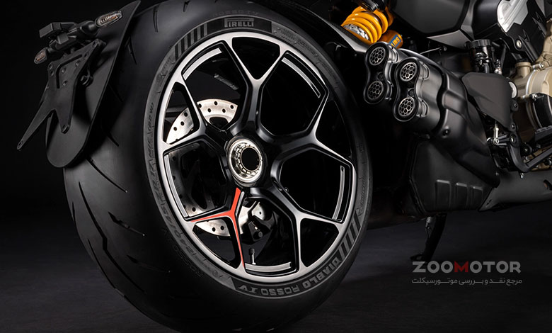 برای حفظ اون ظاهر خشن و عضلانی، Diavel V4 RS کاملاً به سنتِ تایرهای عقبِ پهن وفادار مونده. این بار، با استفاده از تایر جدید Pirelli Diablo Rosso IV سایز 240/45، بزرگ‌ترین تایر عقب استاندارد تاریخ دوکاتی رو داریم. این تایر فوق‌العاده عریض و خیره‌کننده اینجاست تا تضمین کنه تمام اون ۱۸۰ اسب بخار، با حداکثر چسبندگی به آسفالت منتقل بشه.